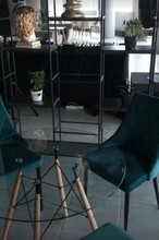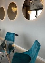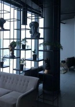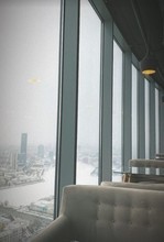 Внутри стильный интерьер, главной изюминкой которого стали панорамные окна. Поэтому отсюда можно полюбоваться красивыми пейзажами днём и не менее впечатляющими картинками ночного мегаполиса. Зал обставлен современной мебелью: стеклянные столы круглой и прямоугольной формы, мягкие белые диваны и глубокие синие кресла. Для декора использовали этажерки, где разместились живые растения в горшках и статуэтки, зеркала на стенах, элегантные каскадные люстры с подвесками.